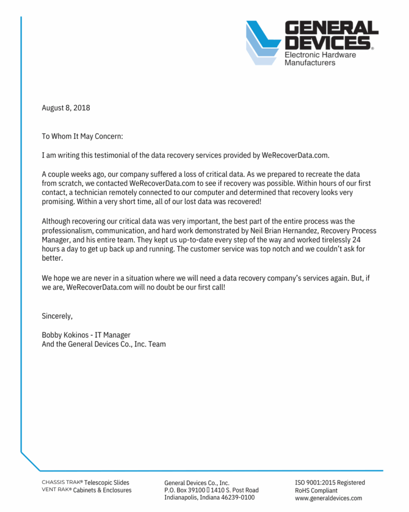 "I received my HDDs back today, and I want to thank you very much for everything that you did to recover our data. I really appreciate you taking time to work through Blue Maxx Marketing’s unique situation and for the outstanding customer service that you provided. You exceeded our expectations! The level of customer service that WeRecoverData.com provided is unparalleled. Starting with my first interaction with telephone support, to the excellent care and courtesy provided by the representative at your Center City Philadelphia drop-off location, to the continued telephone and email updates that were provided during the process, and finally the insurance and processing support. I am a happy-happy-happy customer! Our files have been recovered and to my surprise our file structure is intact. Great job!"